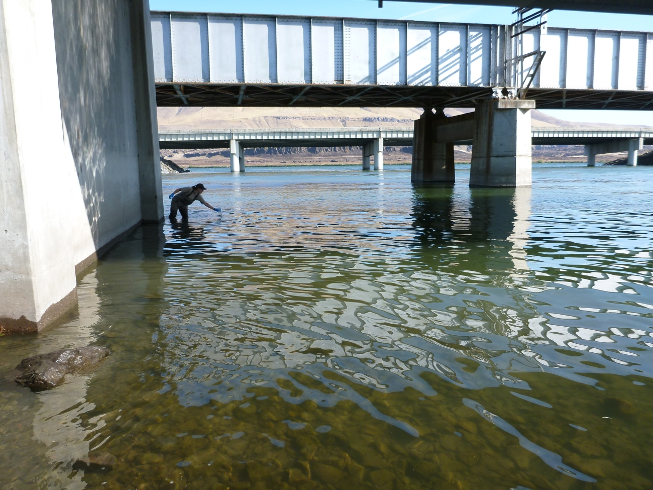 Jen Poirier, a fish biologist with the U.S. Fish and Wildlife Service's Columbia River Fish and Wildlife Conservation Office, collects an eDNA sample from the Deschutes River in Oregon.