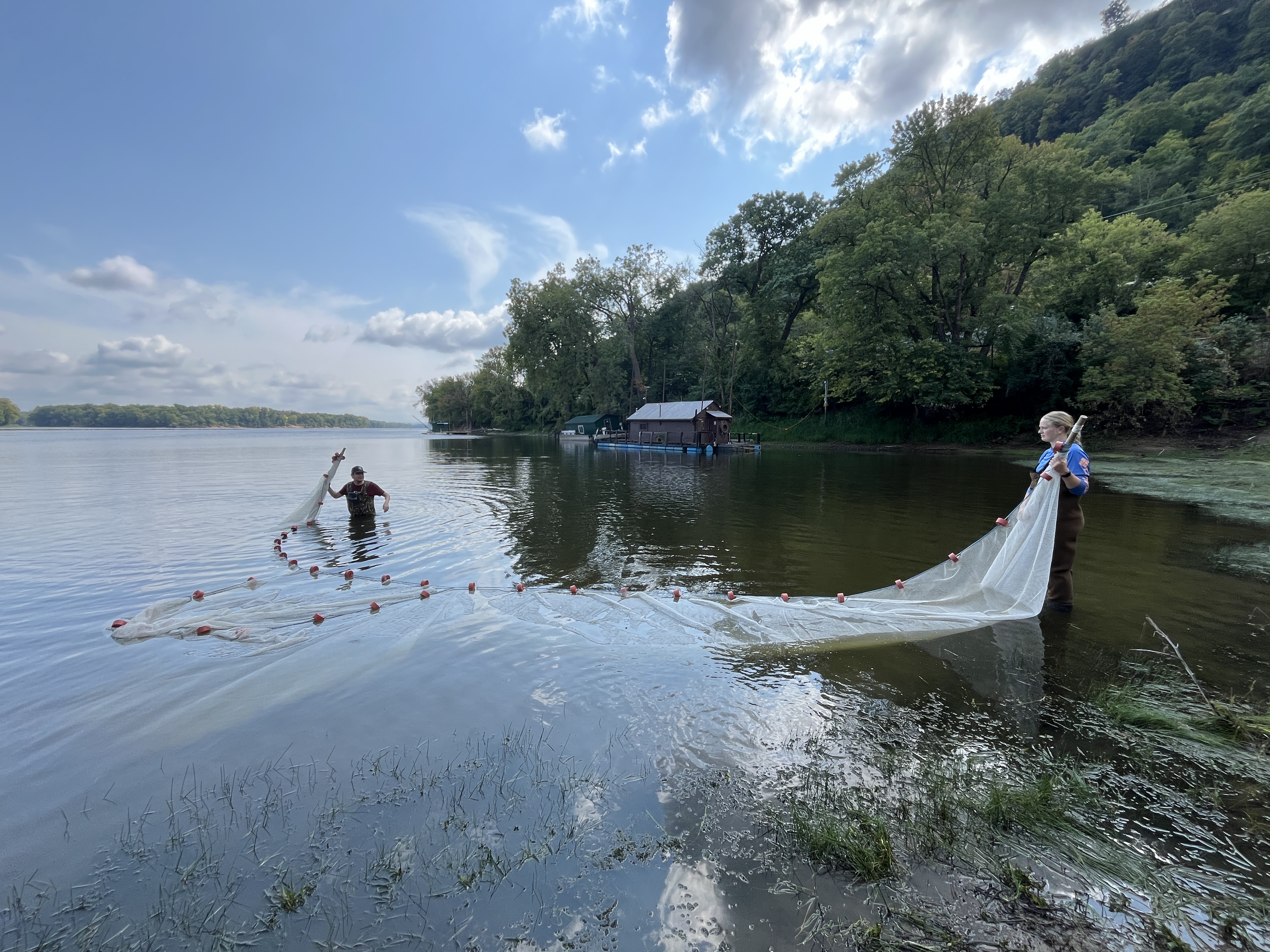 Students from Viterbo University learn how to catch fish using a seine net as part of a outreach program by the Midwest Fisheries Center.