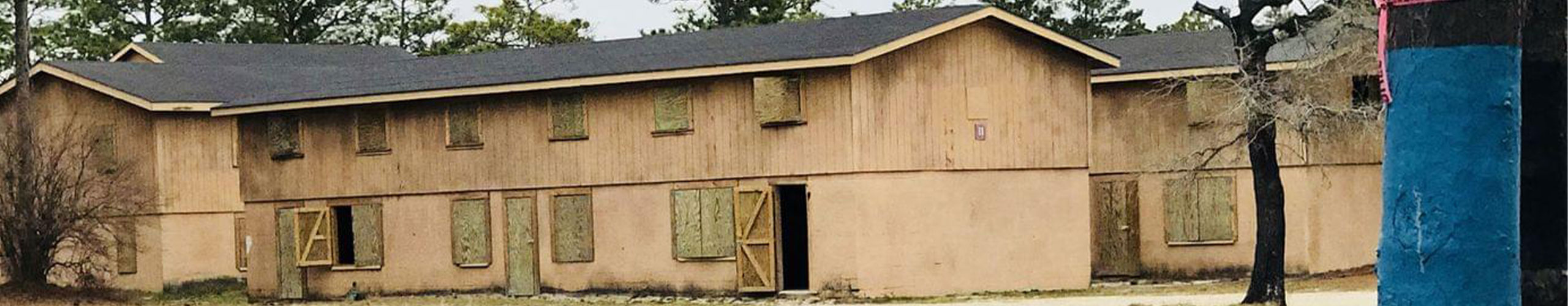 Combat town at Camp Lejeune with a pine tree that is home to a red-cockaded woodpecker cluster.