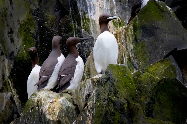 Four common murres perch together on a cliff ledge in Alaska Maritime National Wildlife Refuge.