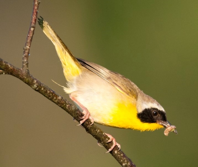 Common yellowthroat perched on a branch preparing to feed nestlings an insect
