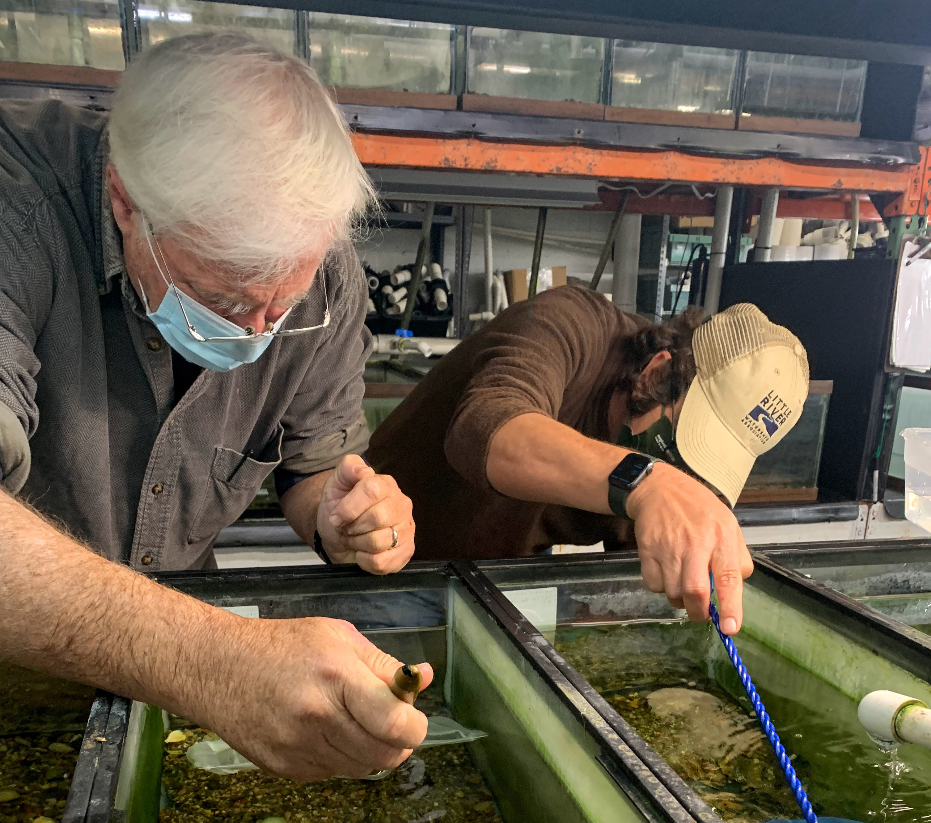 Conservation Fisheries Inc staff collecting Carolina madtom they raised in captivity.