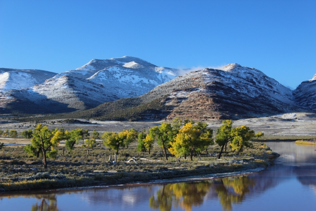 Cottonwoods grow next to the Green River at Browns Park National Wildlife Refuge in Colorado. The snow-capped Diamond Breaks Mountains loom in the background.