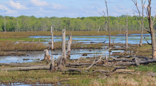 Cranberry Pool wetland management unit at Missisquoi National Wildlife Refuge featuring trees, grasses, and a marsh