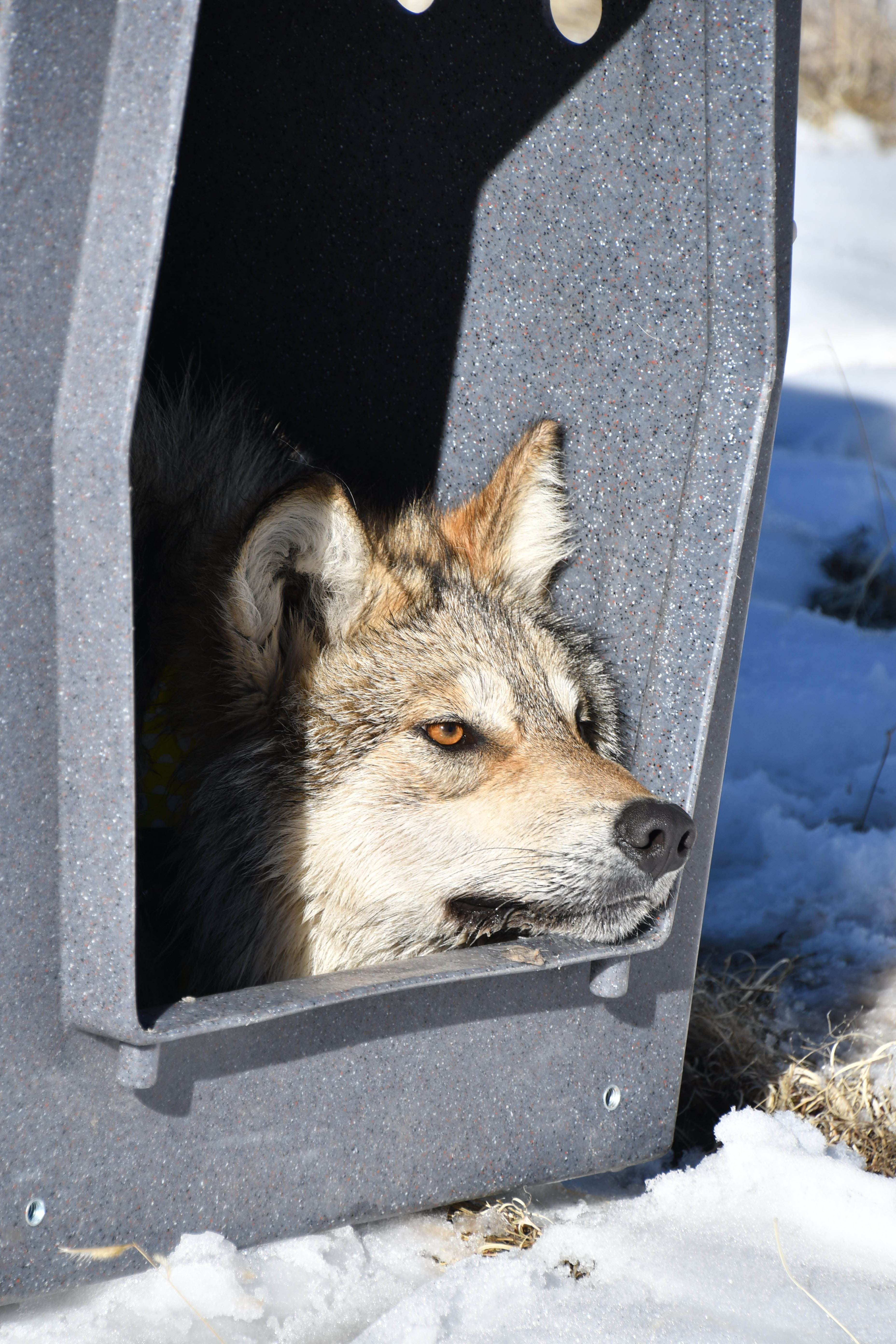 A Mexican wolf wakes up from sedation inside a crate at a release site.