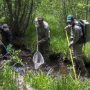 Fish biologists - from left, Katie Moyer, Nolan Banish and Travis Ciotti sample a small creek for brook trout and brook-bull trout hybrids for removal. Removal is the only way to prevent the more aggressive brook trout from taking over the habitat and interbreeding with the native bull trout. Photo courtesy of Oregon Department of Fish and Wildlife