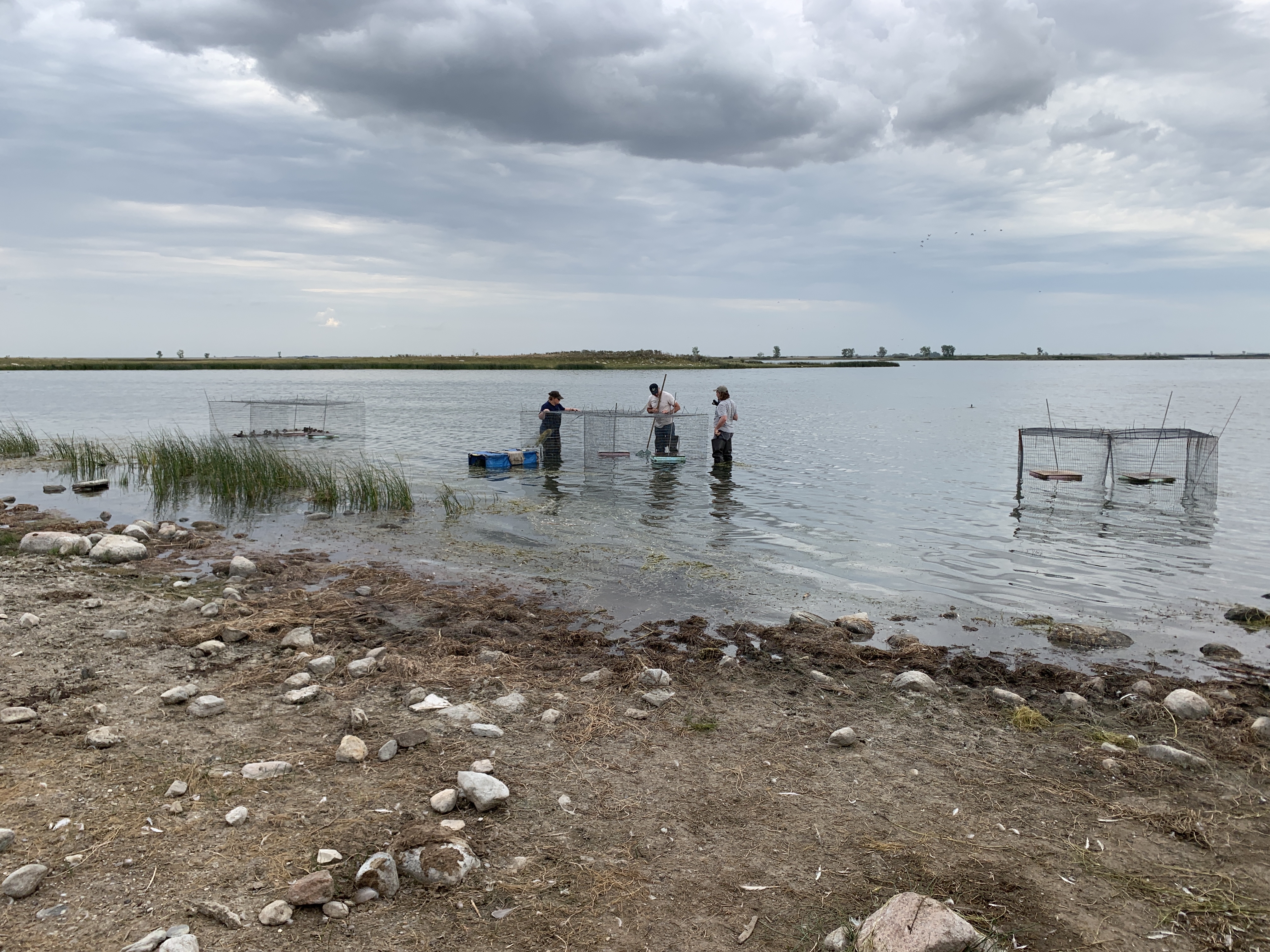 The crew in central Saskatchewan sets up the swim-in traps to catch ducks as part of the 2022 waterfowl banding operations led by the Migratory Bird Program.