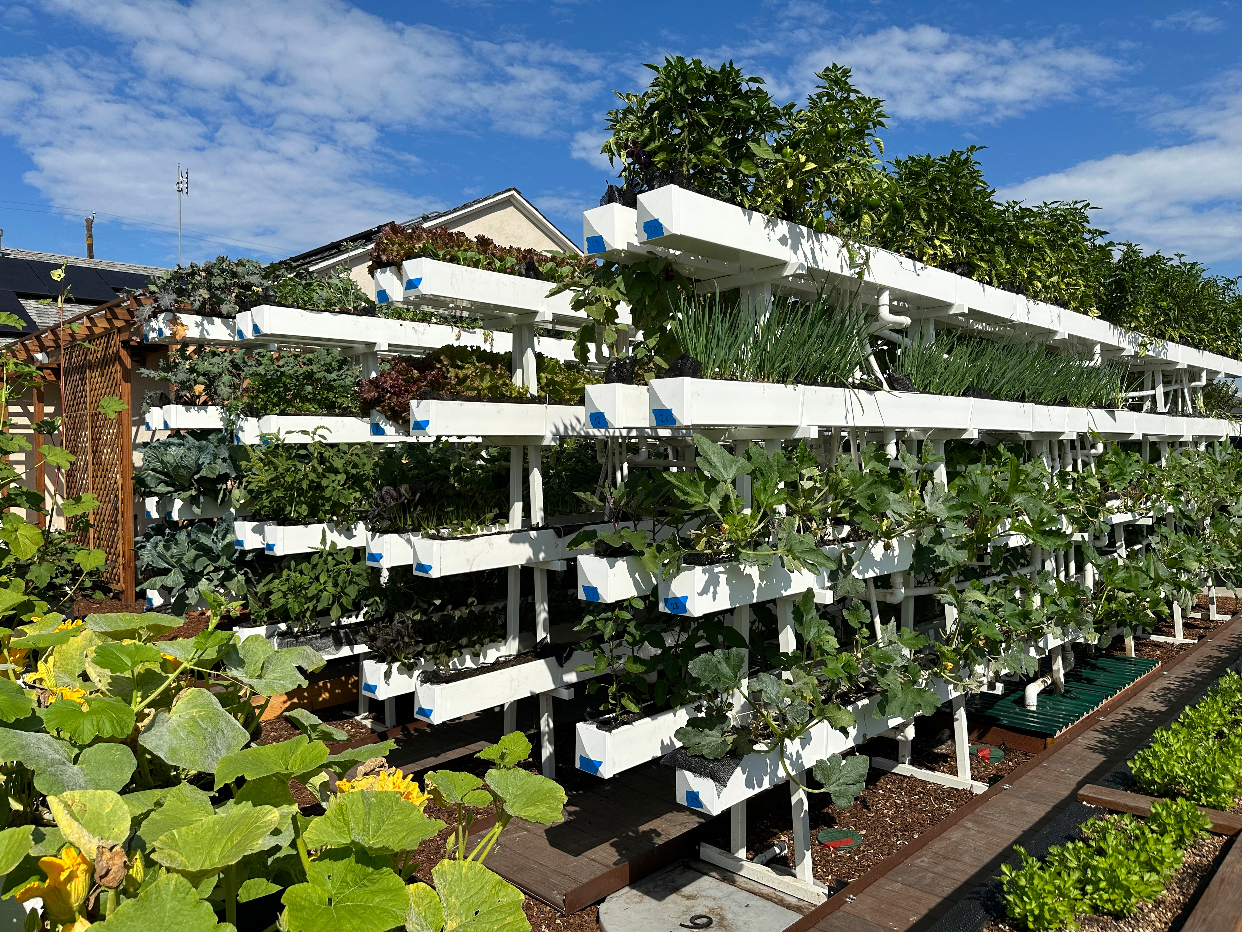 A-frames maximize a small urban space to produce hundreds of lettuce varieties, peppers, herbs and more.