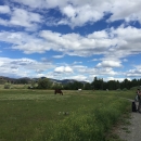 A bicyclist stops to capture a photo on a fine spring afternoon, with horses grazing in the meadow the trail bisects. Methow Community Trail crosses the Winthrop National Fish Hatchery grounds.