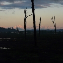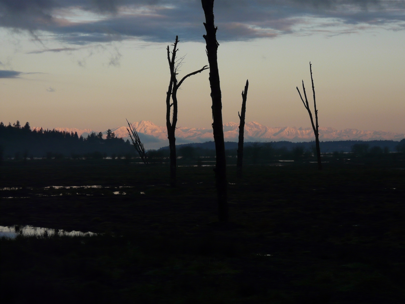 Dawn light flushes the Olympic Mountains, viewed from the Nisqually Delta.