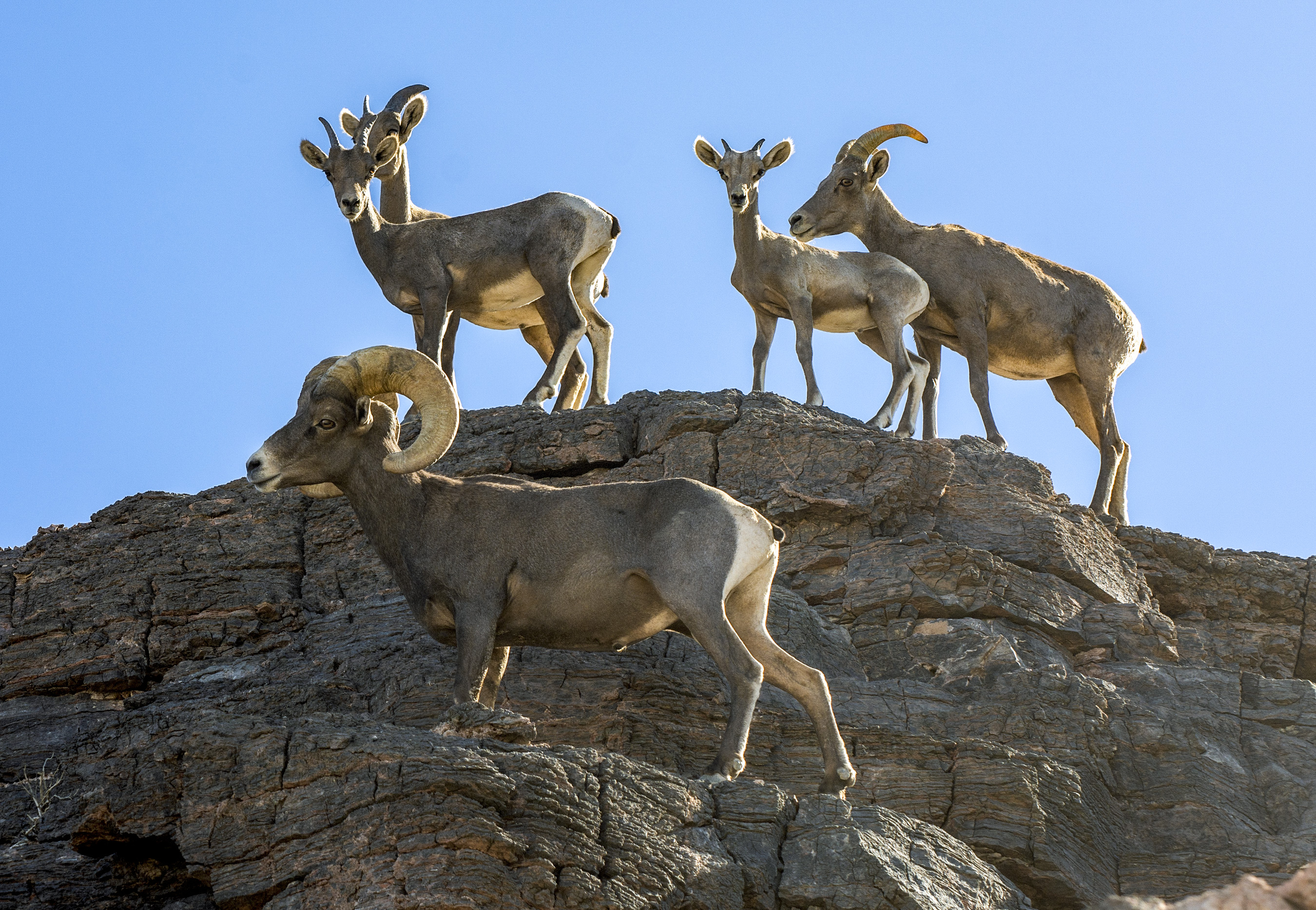 Five Desert bighorn sheep stand on a rocky mountain in Ash Meadows National Wildlife Refuge. Credit: Rod Colvin/USFWS