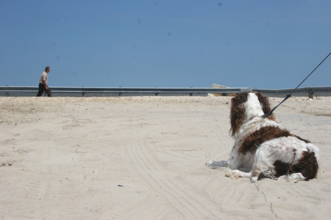 A leashed dog enjoys the view at Prime Hook National Wildlife Refuge in Delaware.