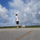A man walking a dog on a levee with blue skies, white puffy clouds, and a rainbow.