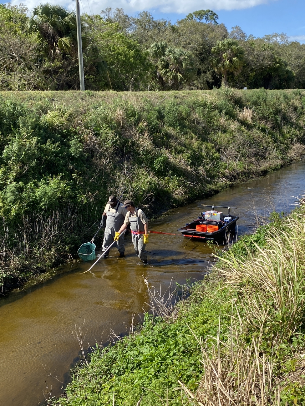Peninsular Florida FWCO fish biologists Eddie Perri and Cedric Doolittle electrofishing a South Florida canal with their newly constructed e-barge