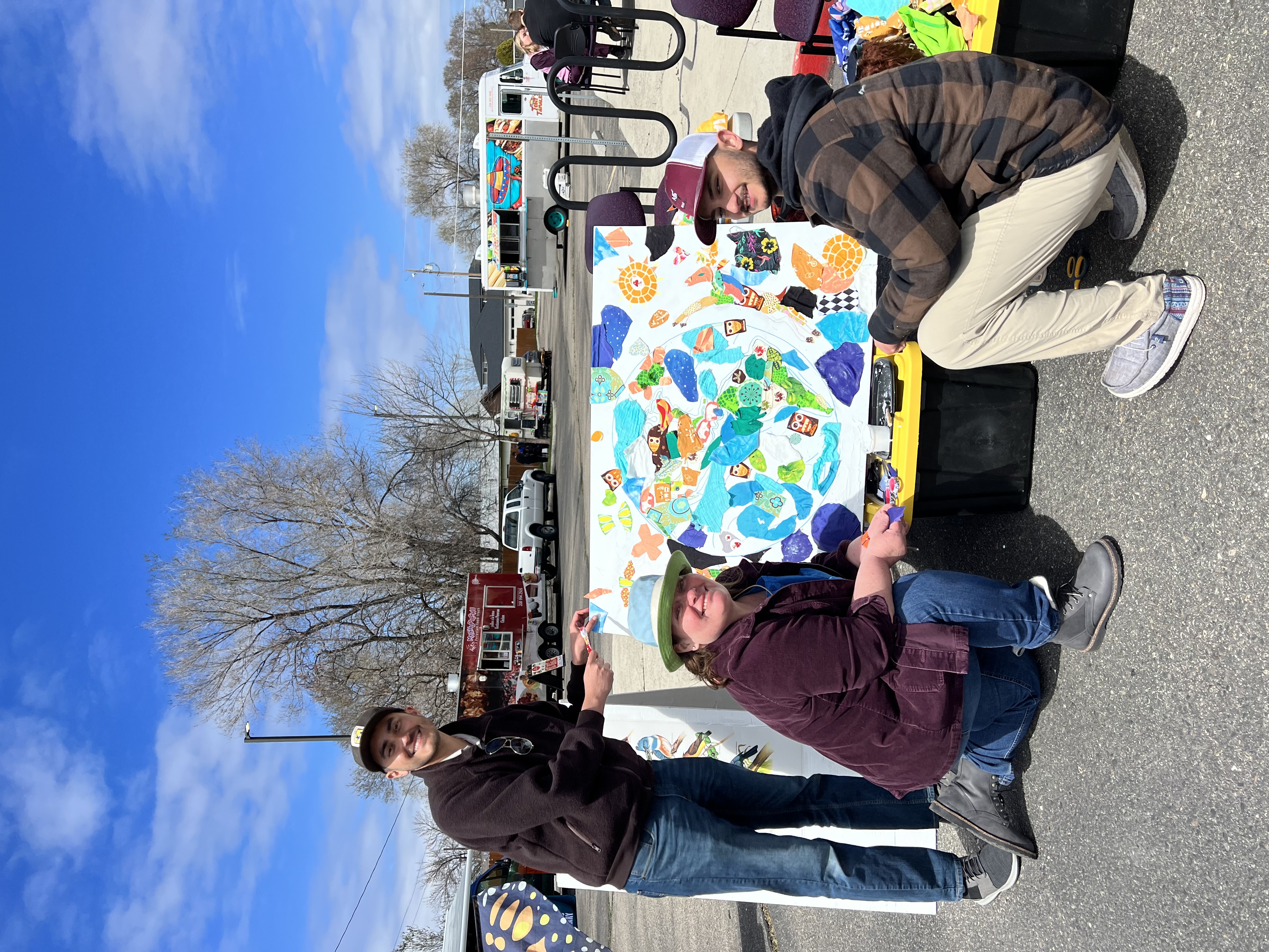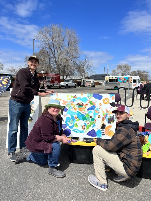 USFWS employees (from left to right), Alfredo Gonzalez, Kelli Barnes, and Thomas Serrano offered a recycled art activity to visitors. Clothing and fabric scraps were added to a sketch of the earth.