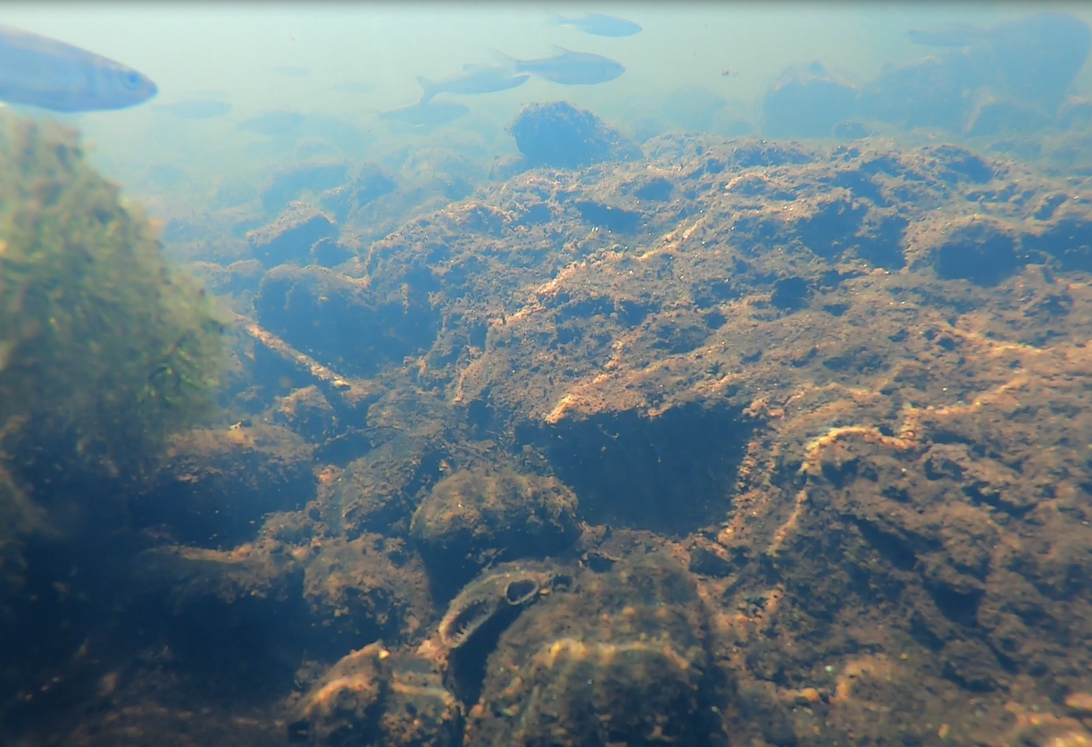 An eastern elliptio mussel blends into the rocky river bottom.