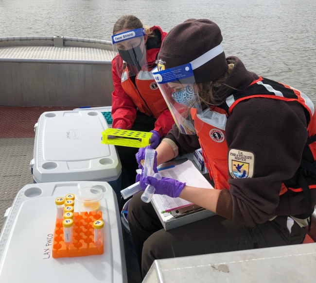 Biologists from the La Crosse Fish and Wildlife Office in La Crosse, Wisconsin prepare tubes for water sample collection during an invasive carp eDNA sampling event on the Mississippi River.