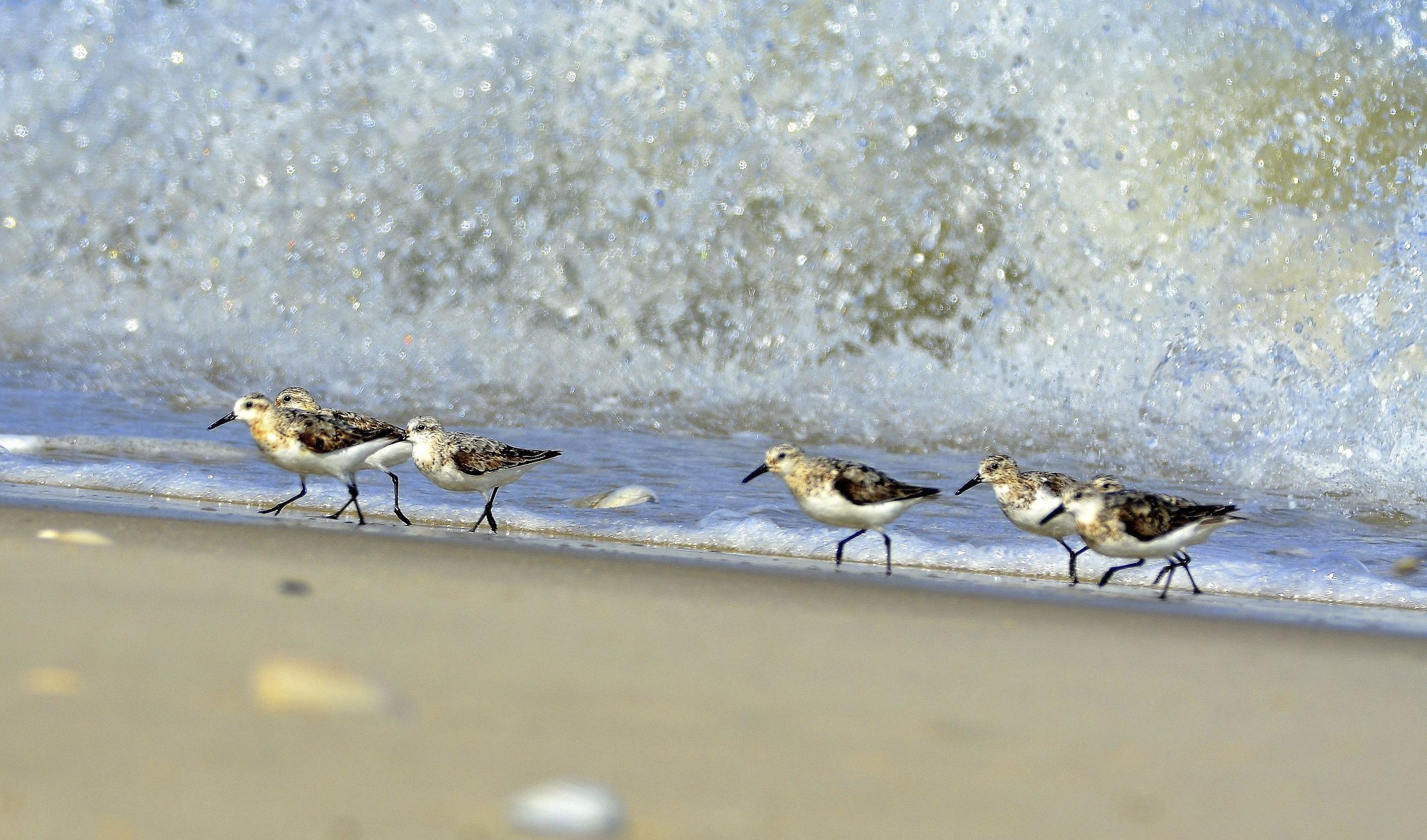 Sanderlings negotiate surf and shoreline at Edwin B. Forsythe National Wildlife Refuge wilderness in New Jersey.