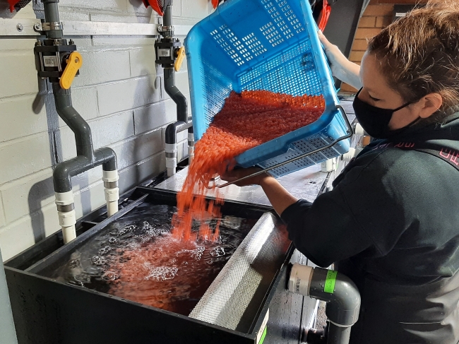 Hatchery employee Jane Lemieux transferring eggs at Quinault National Fish Hatchery.