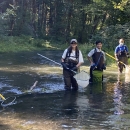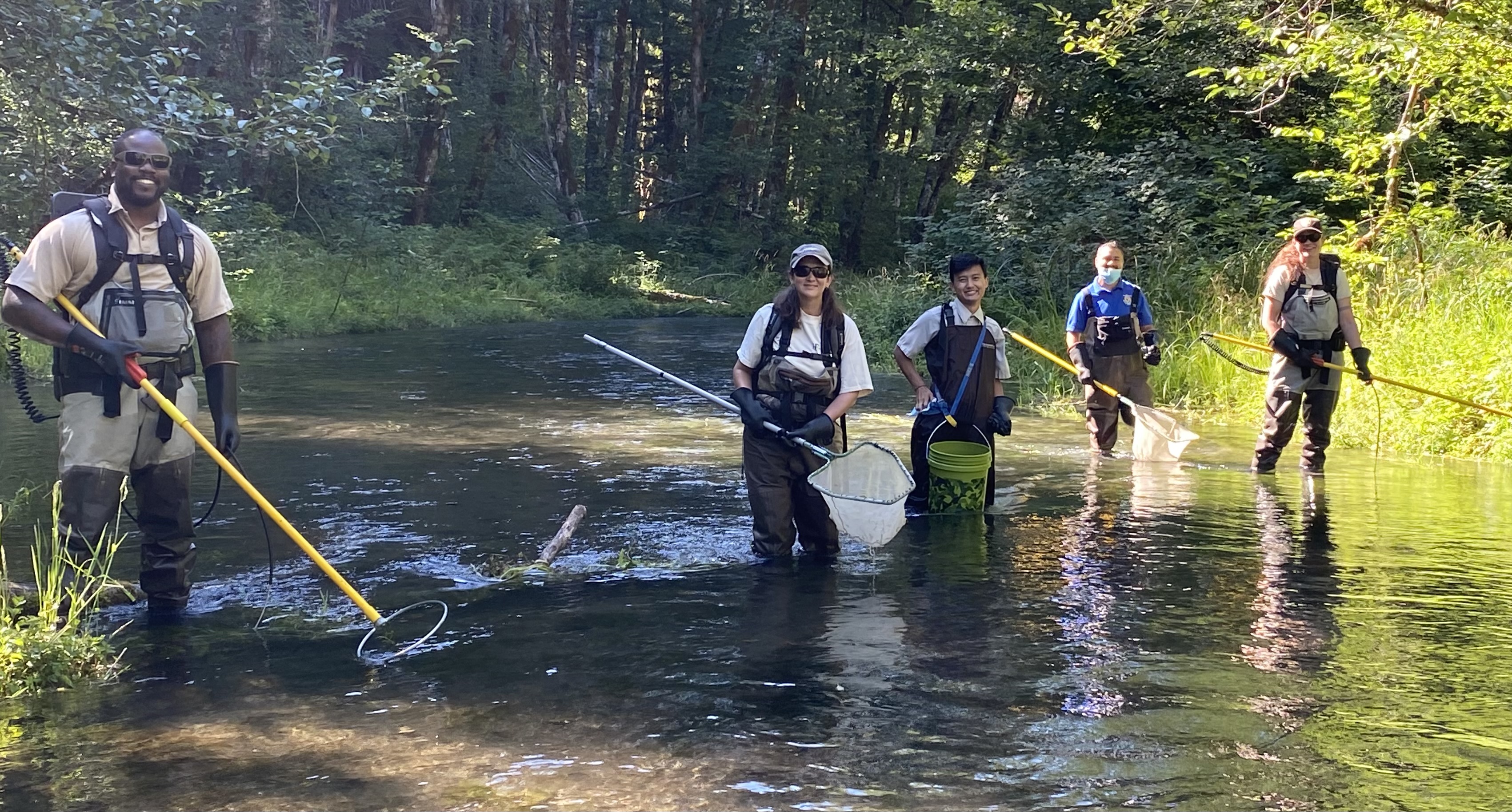 Rikeem Sholes, Julianne Harris, Ywj Pheej Isaac Yang, Juan Jose Mora Flores and Jen Poirier electro-shock bull trout in Tyee Springs; the water source for Carson National Fish Hatchery.