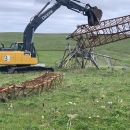 An excavator picks up a portion of a rusted radio tower at Alaska Maritime National Wildlife Refuge.