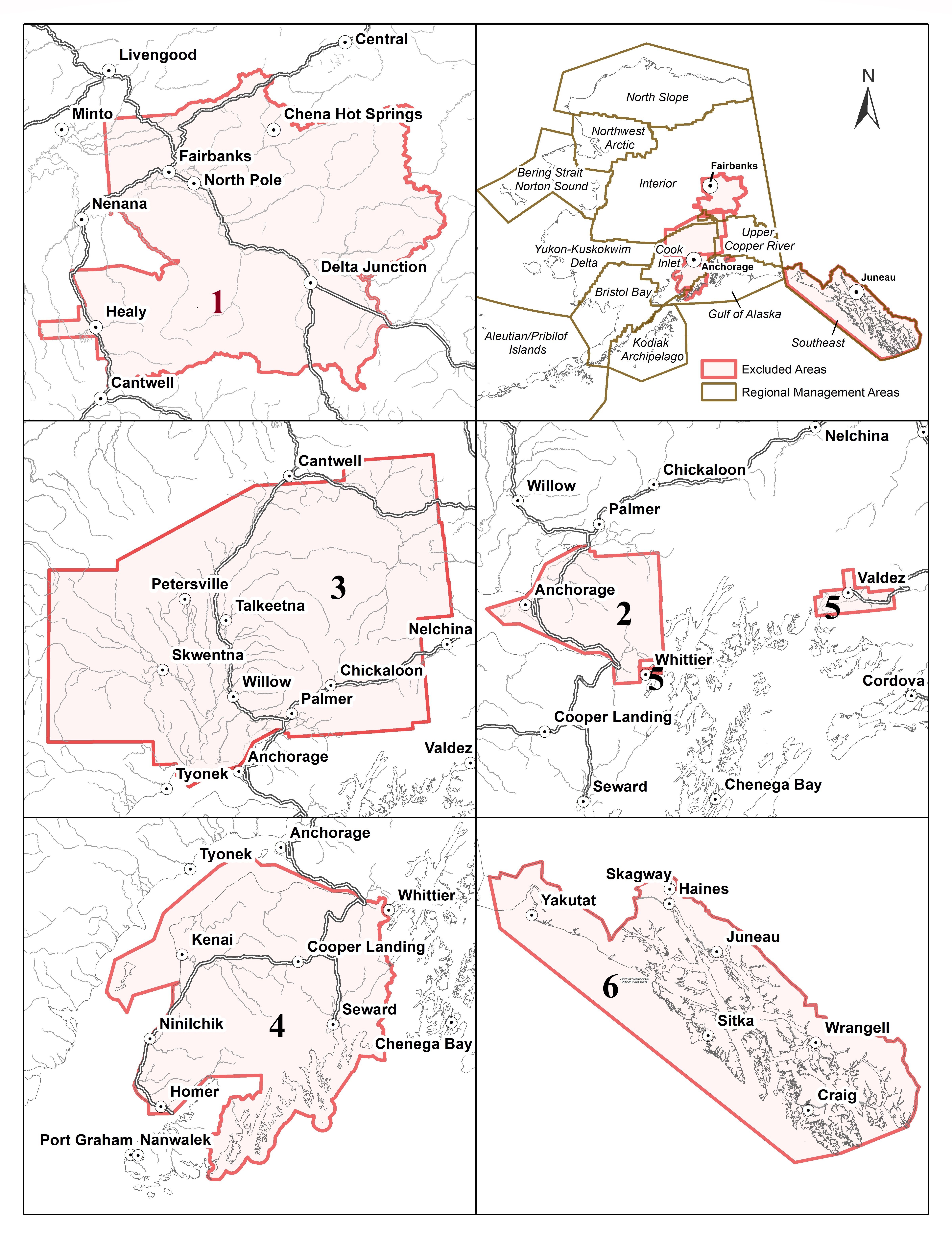 The excluded areas where harvest of migratory birds is not allowed for the spring/summer migratory bird subsistence hunt in Alaska. Exceptions are for any portion of the excluded area that falls within a harvest area that has been designated for a specific community (see Region-Specific Regulations sections).