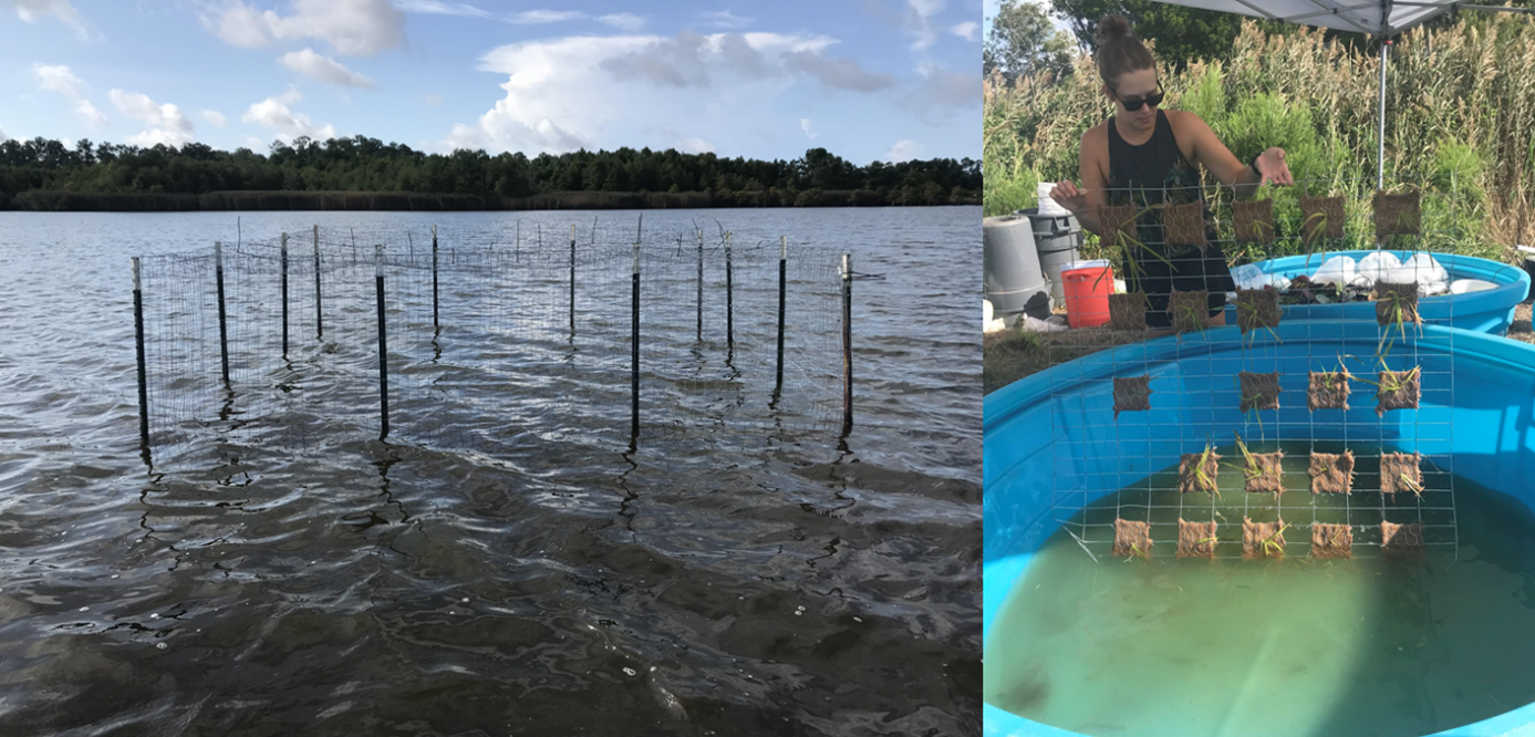 North Carolina State University graduate student April Lamb, working with Dr. Jesse Fischer, tested growing wild celery (Vallisneria americana), a type of submerged aquatic vegetation (SAV), in Lake Mattamuskeet in exclosures designed to keep out invasive common carp. Plants in the exclosures survived longer than plants outside the exclosures, showing promise for SAV restoration in the lake if carp populations are reduced.