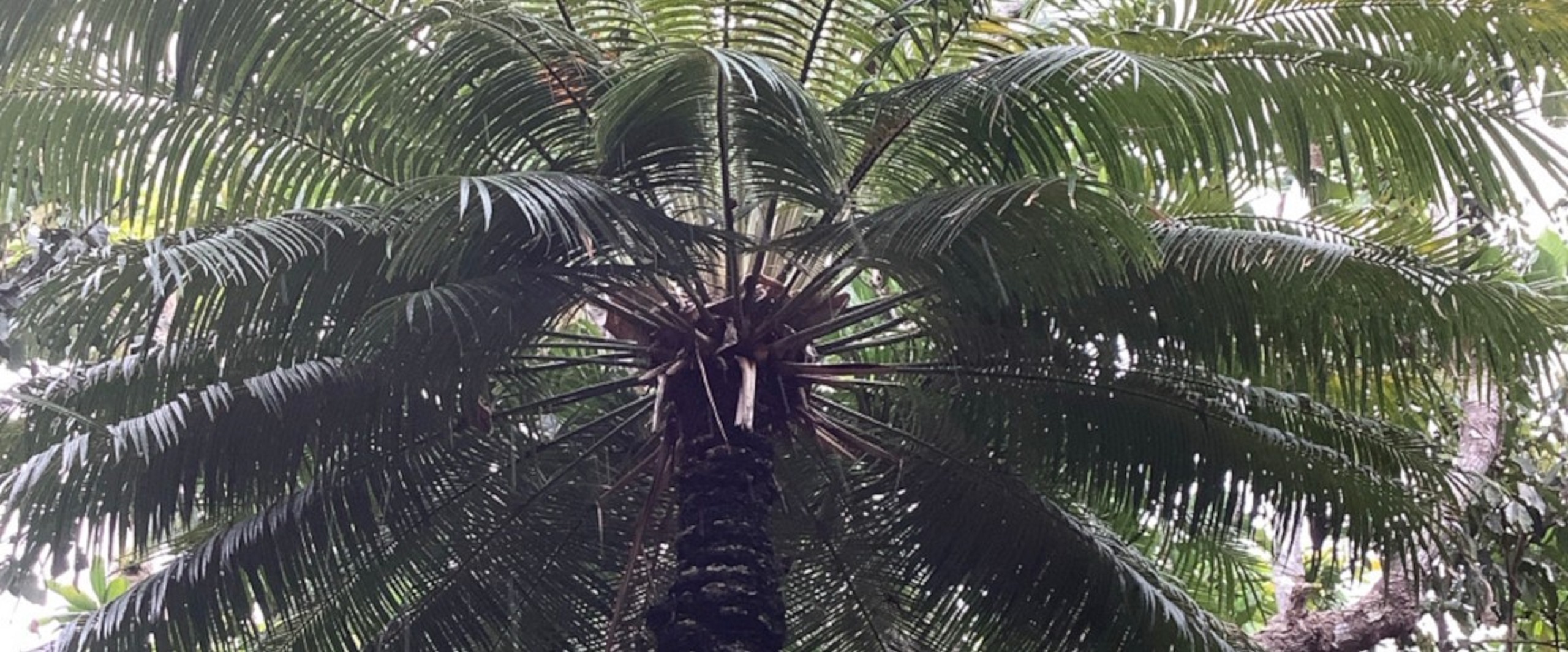 A fadang's crown with green and healthy looking leaves. The background is a native limestone forest found on the Guam National Wildlife Refuge.