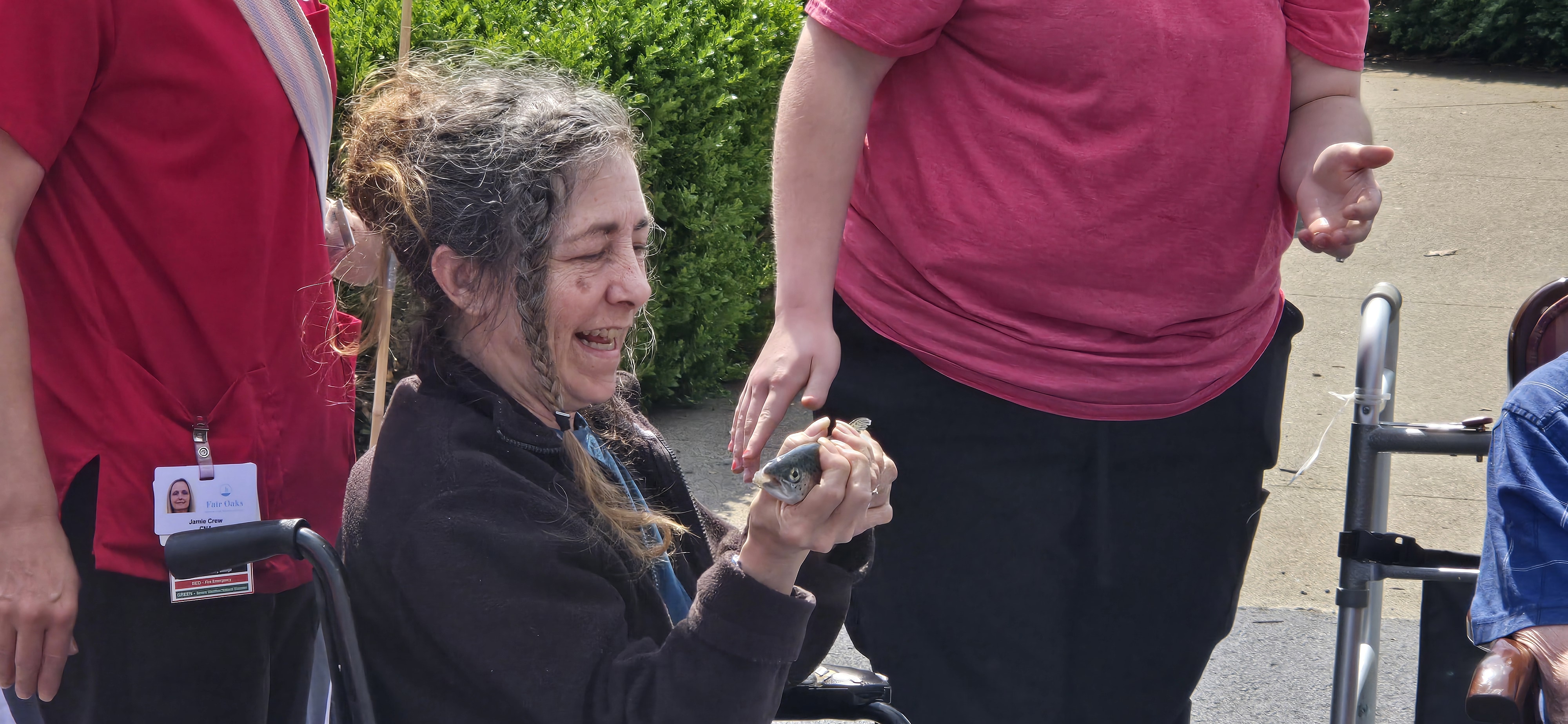 A resident of Fair Oaks Health & Rehabilitation proudly displaying the rainbow trout she caught while fishing outside the facility.