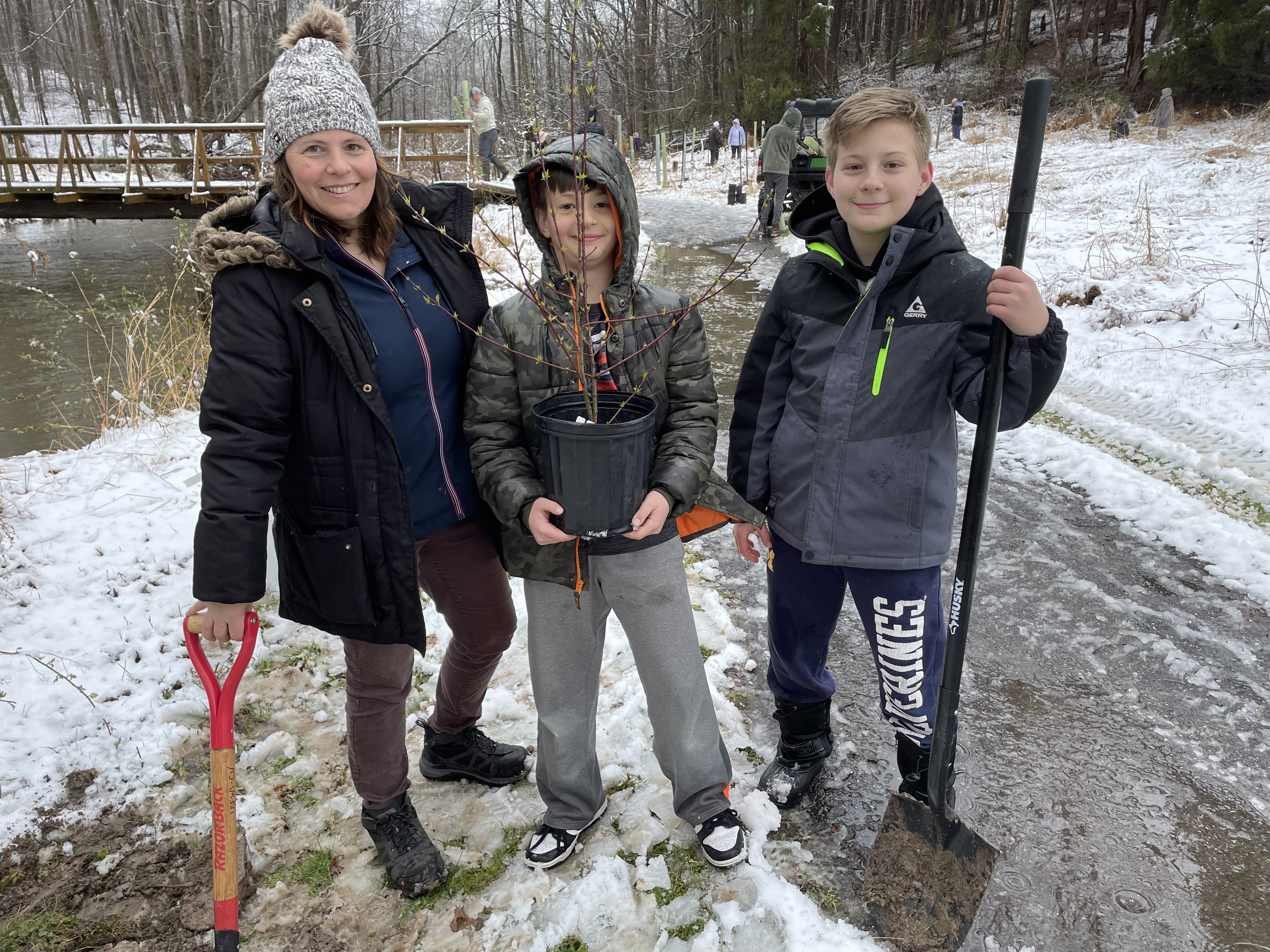 Volunteer Franciska Flamm and her family hold one of the shrubs that they planted at the Cherry Valley National Wildlife Refuge Earth Day Celebration and Volunteer Tree Planting Program.