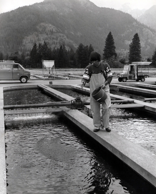 Feeding fish at Leavenworth National Fish Hatchery looks much the same today as it did decades ago. Feeding is done by hand, so the fish can be closely observed and feed is evenly distributed.