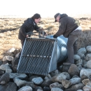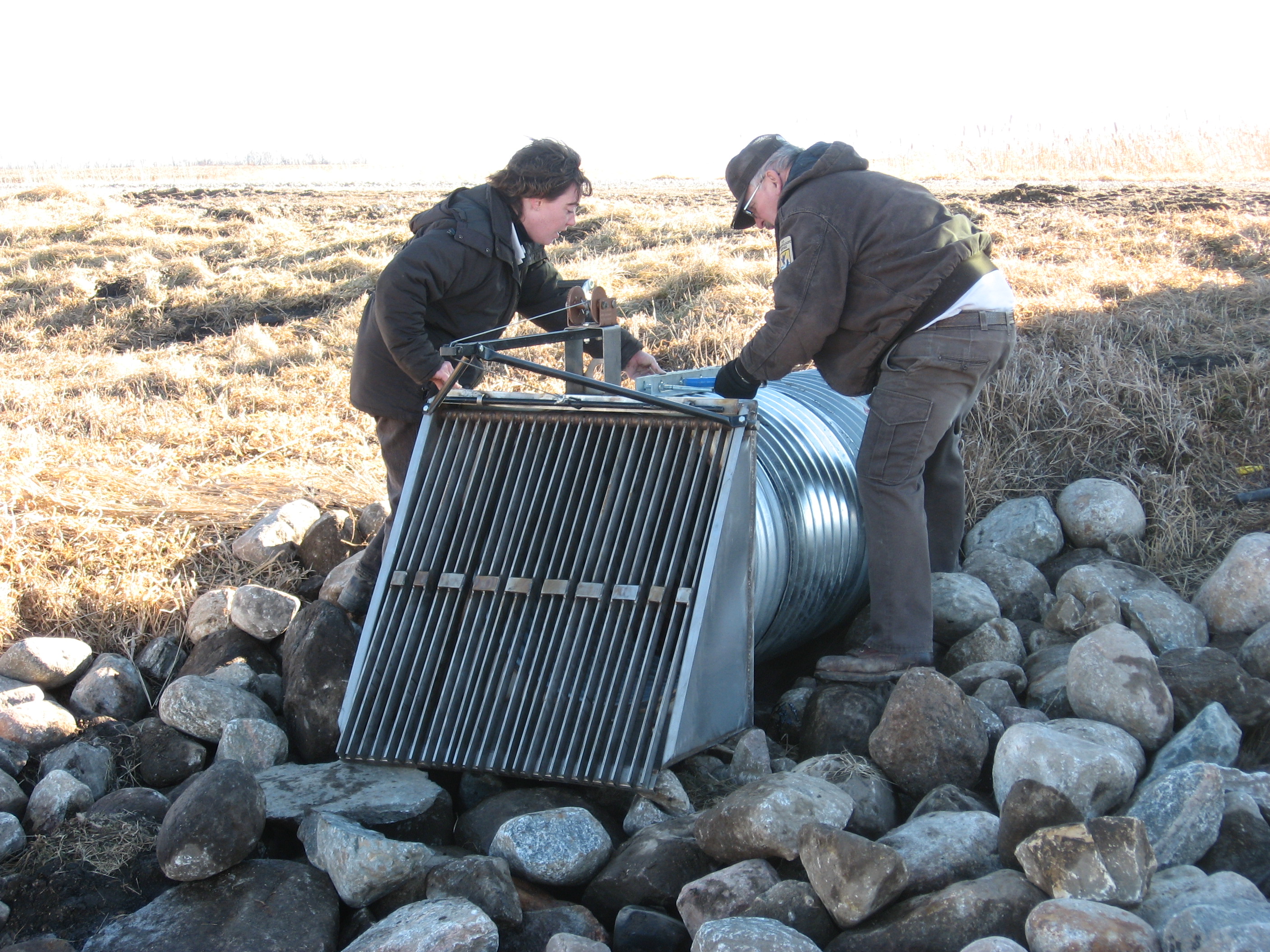 Two district staff install a fish barrier at Cheney Trust Waterfowl Production Area in Grant County to prevent invasive fish from entering a wetland.