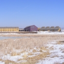The Prairie Wetlands Learning Center buildings in the snowy prairie near the frozen Mallard Marsh