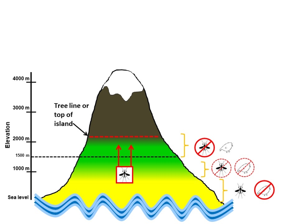 This figure represents the safe areas for forest birds that lie between where the tree lines end and the mosquito area begins.