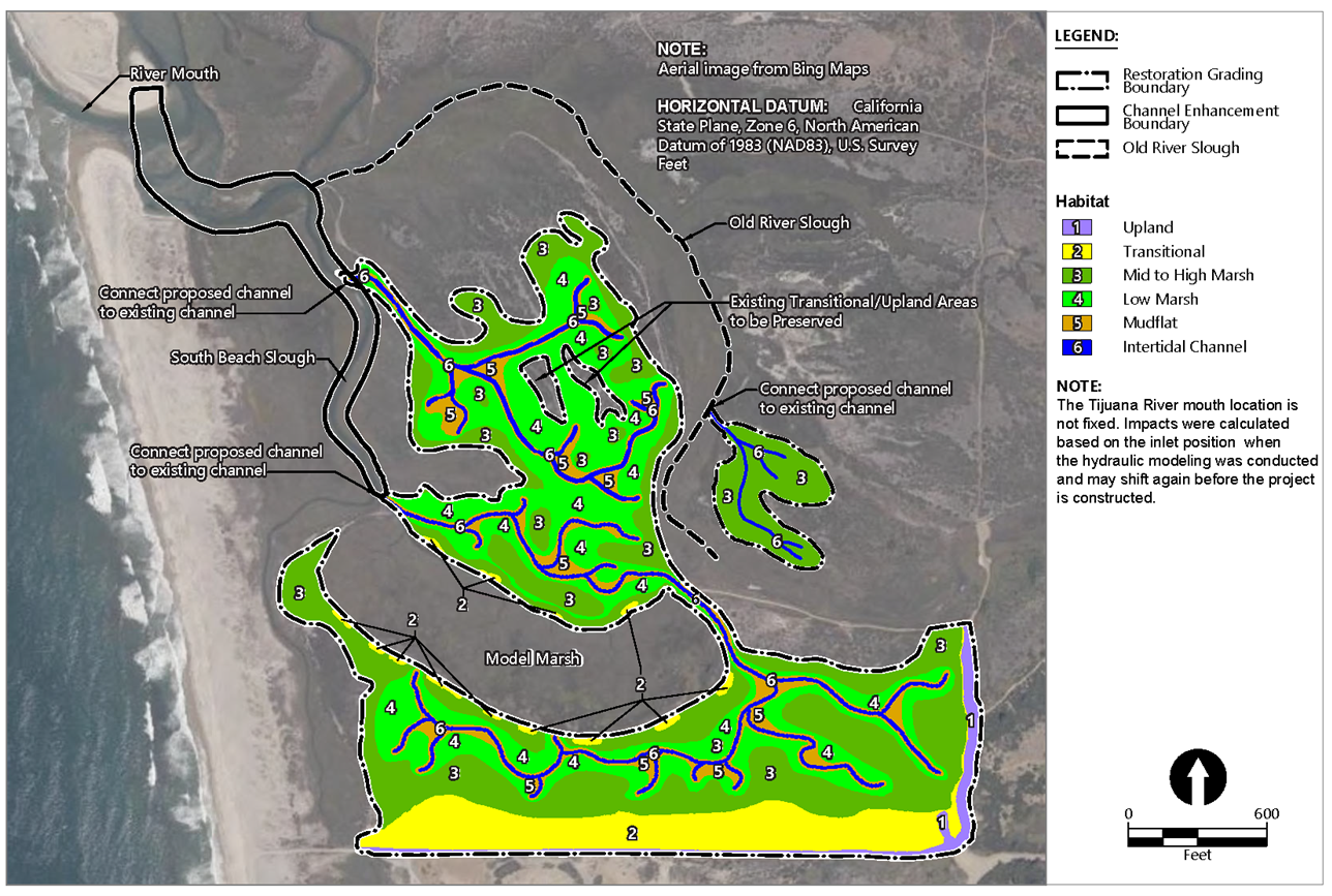 This is a detailed restoration plan for Alternative 2, the Proposed Project. A larger area of restored low marsh habitat, surrounded by areas of mid to high marsh to the north and south of the existing Model Marsh. are proposed under this alternative. The restored area would be connected to the South Beach Slough. Smaller areas of mudflat habitat would be restored at the intersections of the newly created intertidal channels. A separate smaller restoration area to the east of the main restoration site would be connected to the Old River Slough. Restored habitat would include intertidal channels surrounded by mid to high marsh. Native transitional habitat is proposed in small areas along both the northern and southern edge of the previously restored Model Marsh. Existing native transitional habitat would occur along the southern boundary of the site and native upland habitat would be present along the southeast and east edge of the restored wetland.