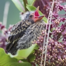 Fledgling red-winged blackbird on a common milkweed plant.