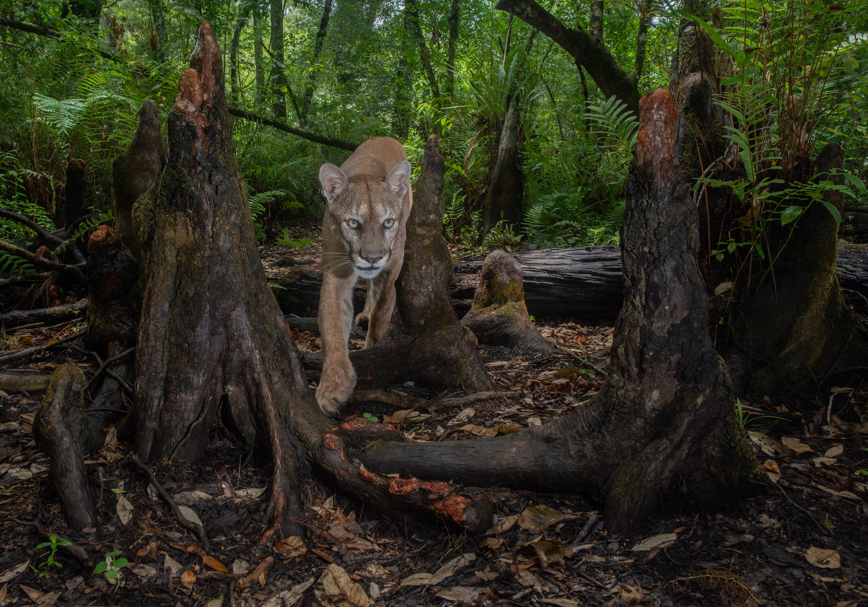 A Florida panther is photographed in the wild. The image was captured with remote cameras, lights and patience. Getting an impactful image of this secretive species can take years.