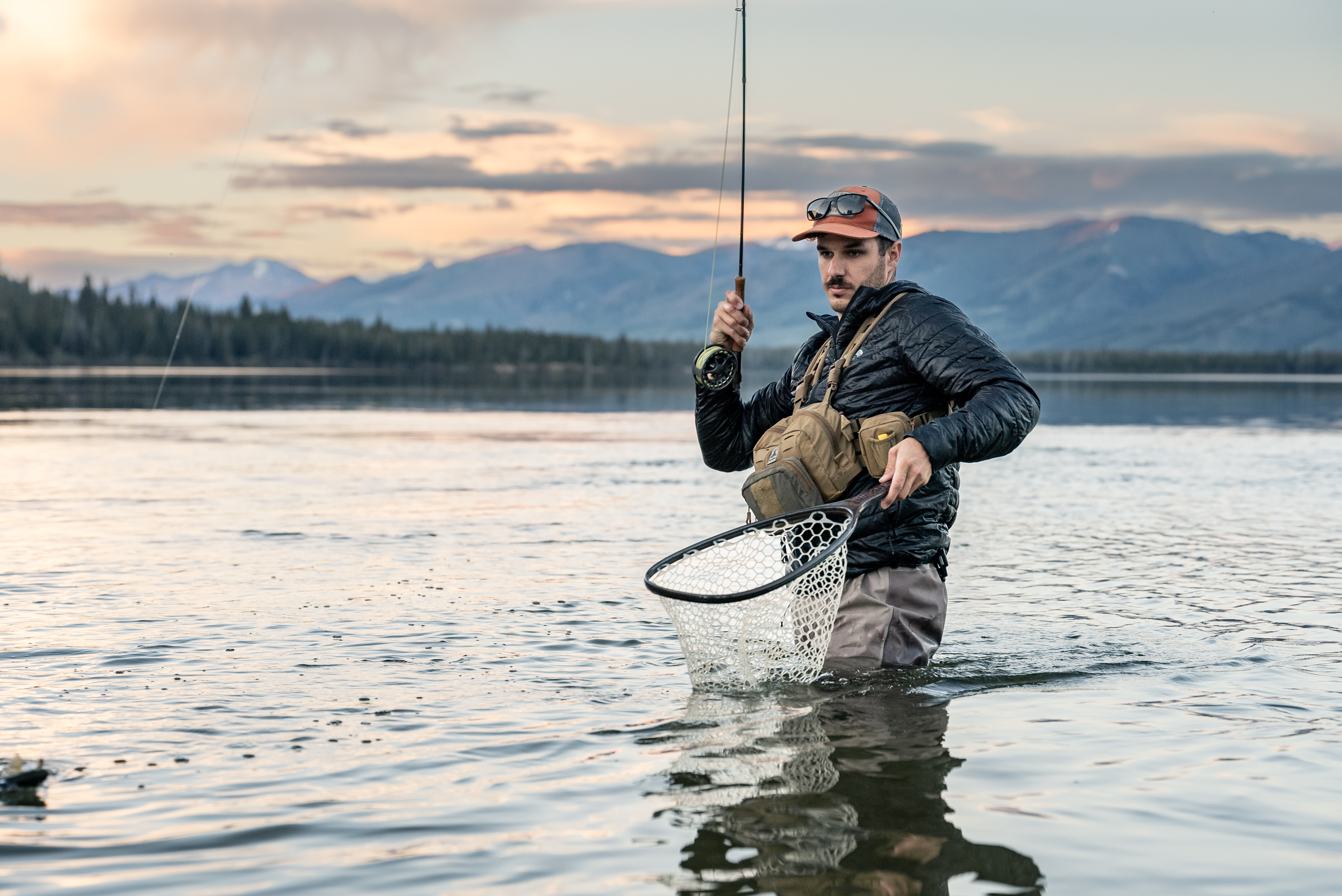 Fly fishing angler uses net to land trout in Idaho waterway.