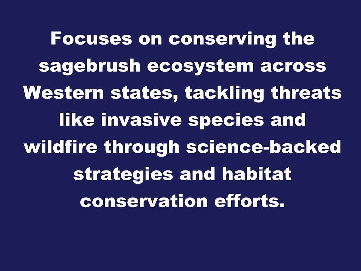 Focuses on conserving the sagebrush ecosystem across Western states, tackling threats like invasive species and wildfire through science-backed strategies and habitat conservation efforts.