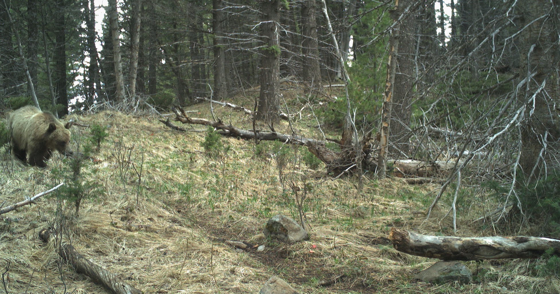 A grizzly bear traverses the forest floor at Red Rock Lakes National Wildlife Refuge and is photographed with a remote wildlife camera. While visiting the Refuge, it is strongly recommended to have bear spray on your person and follow safety precautions during your visit.