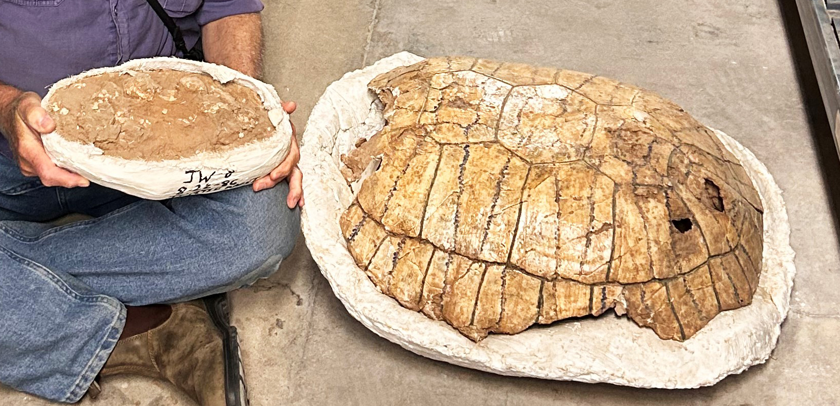 Herpetologist Dr. Harry Greene, Professor Emeritus at Cornell University, holds fossilized eggs next to a fossilized shell of the extinct Gopherus hexagonatus tortoise species that was native to North America. This species went extinct toward the end of the Pleistocene (ice age).