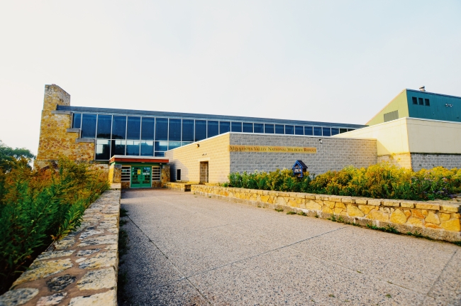 The front entrance of the Bloomington Education and Visitor Center at Bloomington, at Minnesota Valley National Wildlife Refuge.