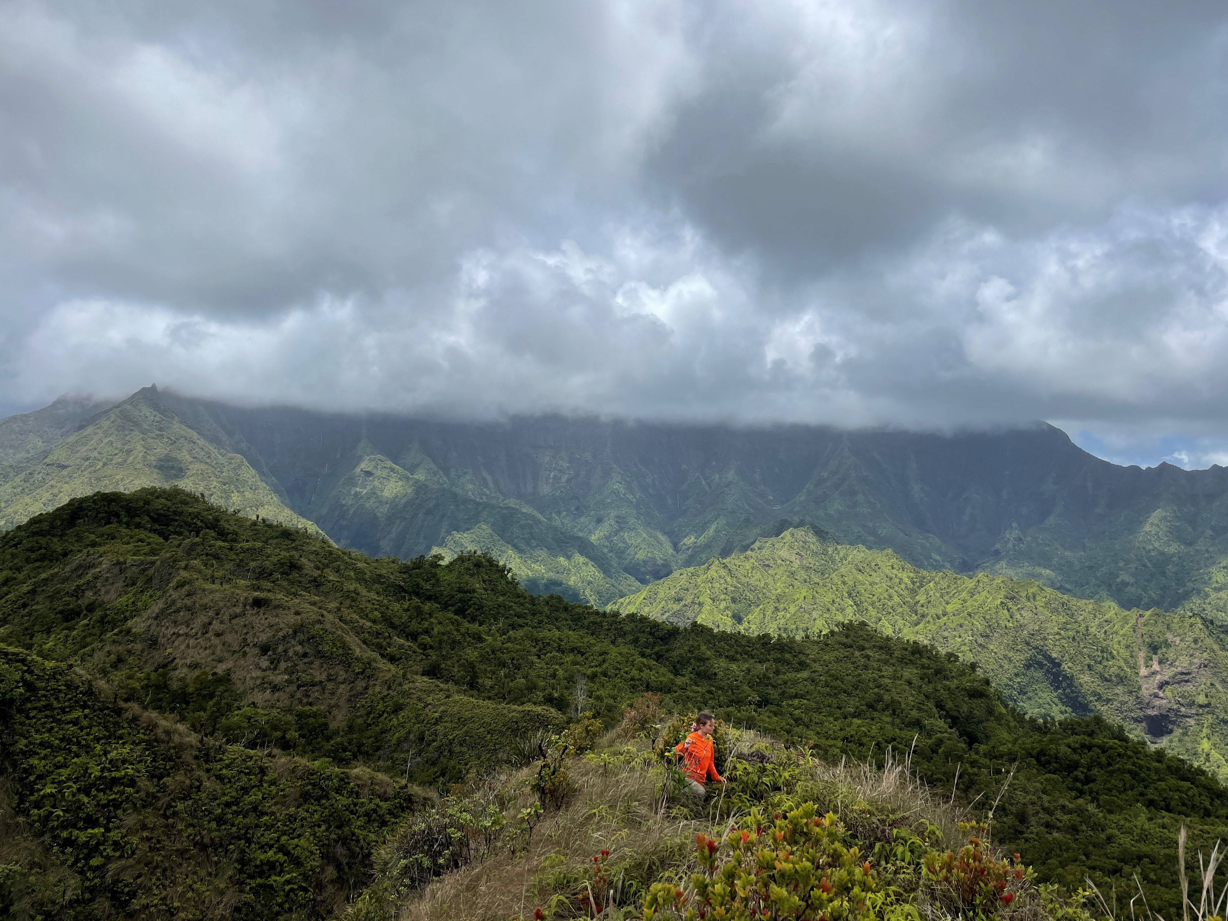 Game survey researcher hikes rough terrain placing game cameras and conducting sign surveys.