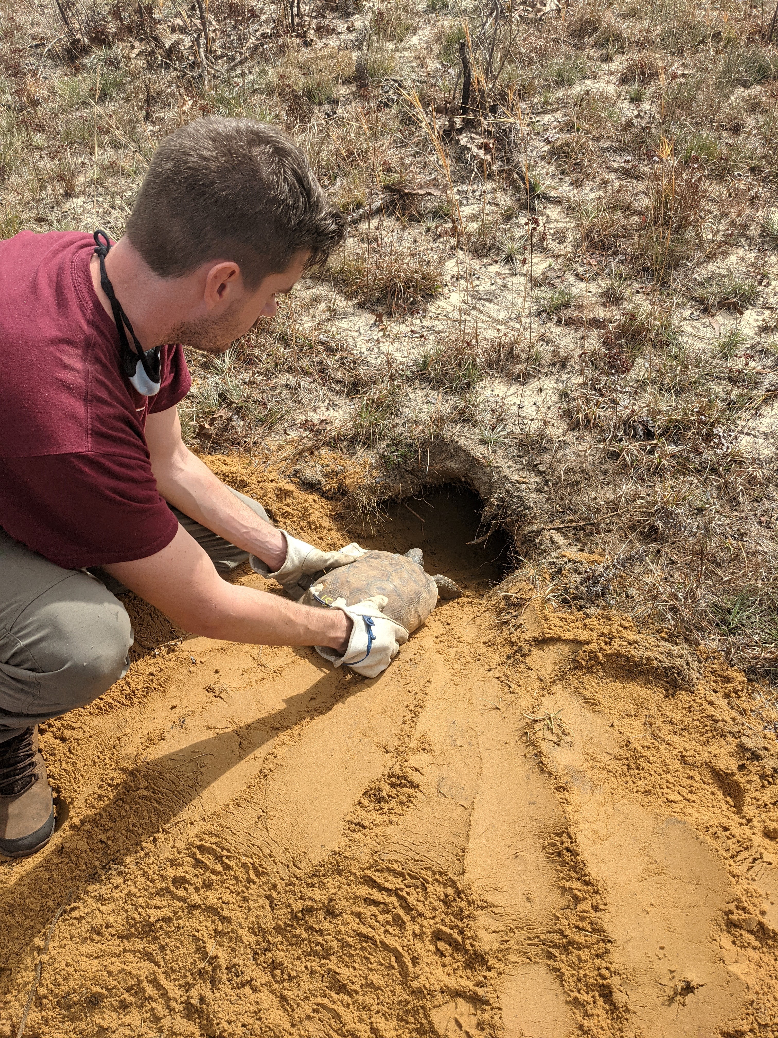 A gopher tortoise is released into a burrow at Eglin Air Force Base.
