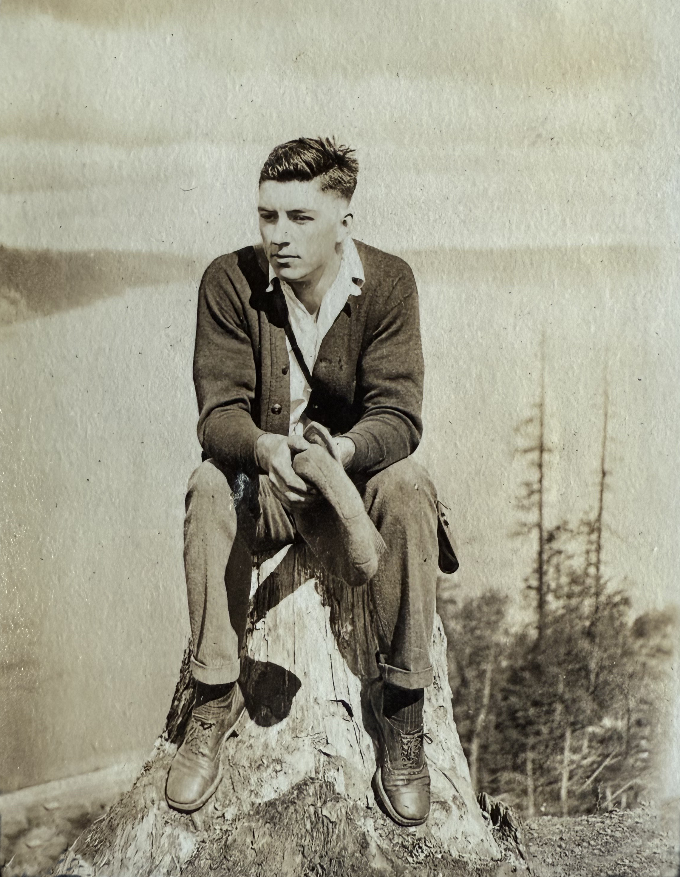 Gordon Alcorn perched atop a stump high above Puget Sound.