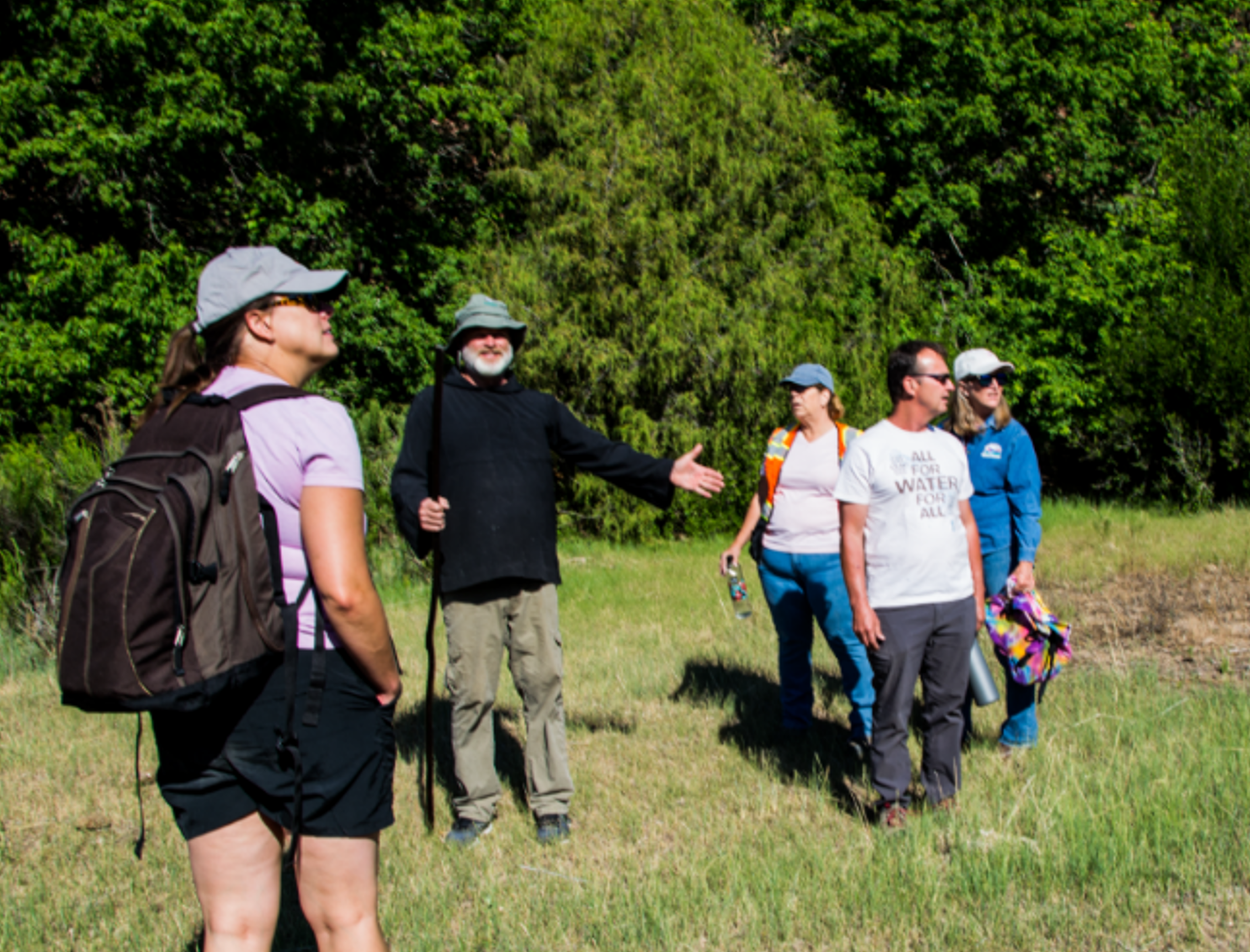 The Rio Gallinas' downstream of a point of diversion is a complex and verdant ecosystem, containing an active sand bed channel and a multi-structured riparian floodplain. Here, a group of people stand in a grassland area in the Rio Gallinas' floodplains.