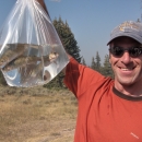 Professional trombonist holding a bag of Snake River cutthroat trout to be put in a backpack and hiked 5 miles to Grizzly Lake in Wyoming.