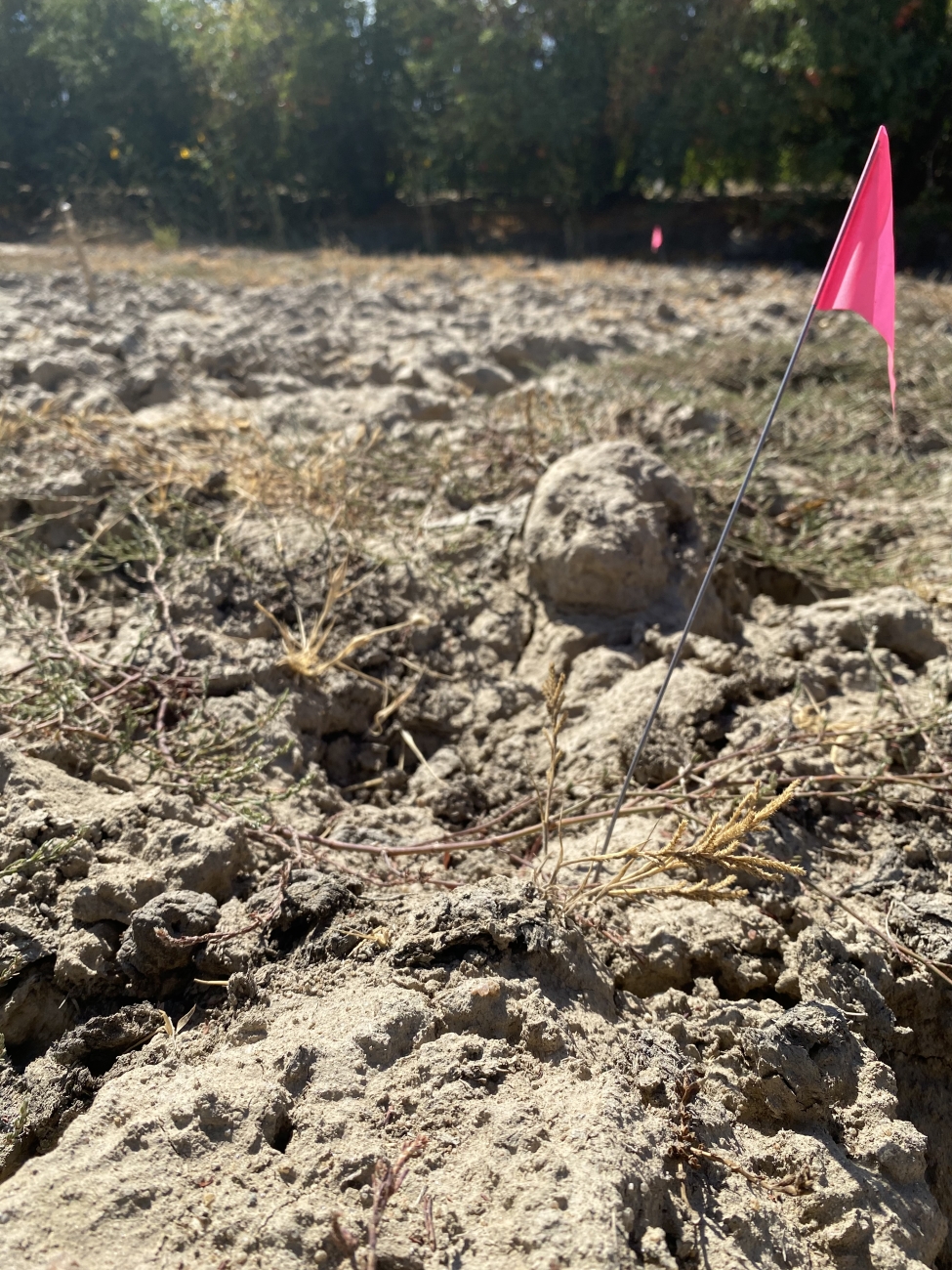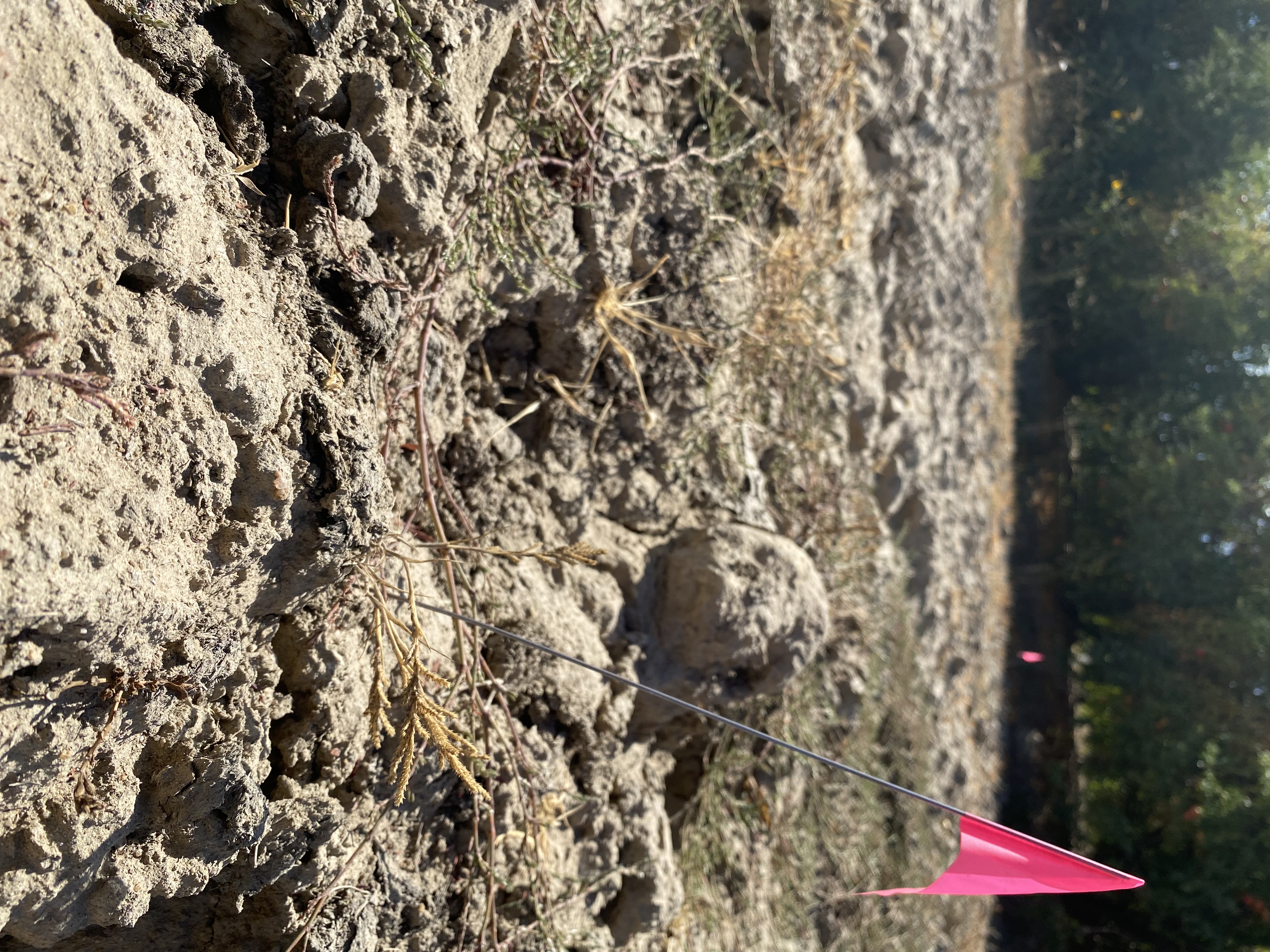 Hairy Orcutt grass, an endangered plant, flagged at a mitigation site. Hairy Orcutt grass goes through seasonal phases of green and brown.