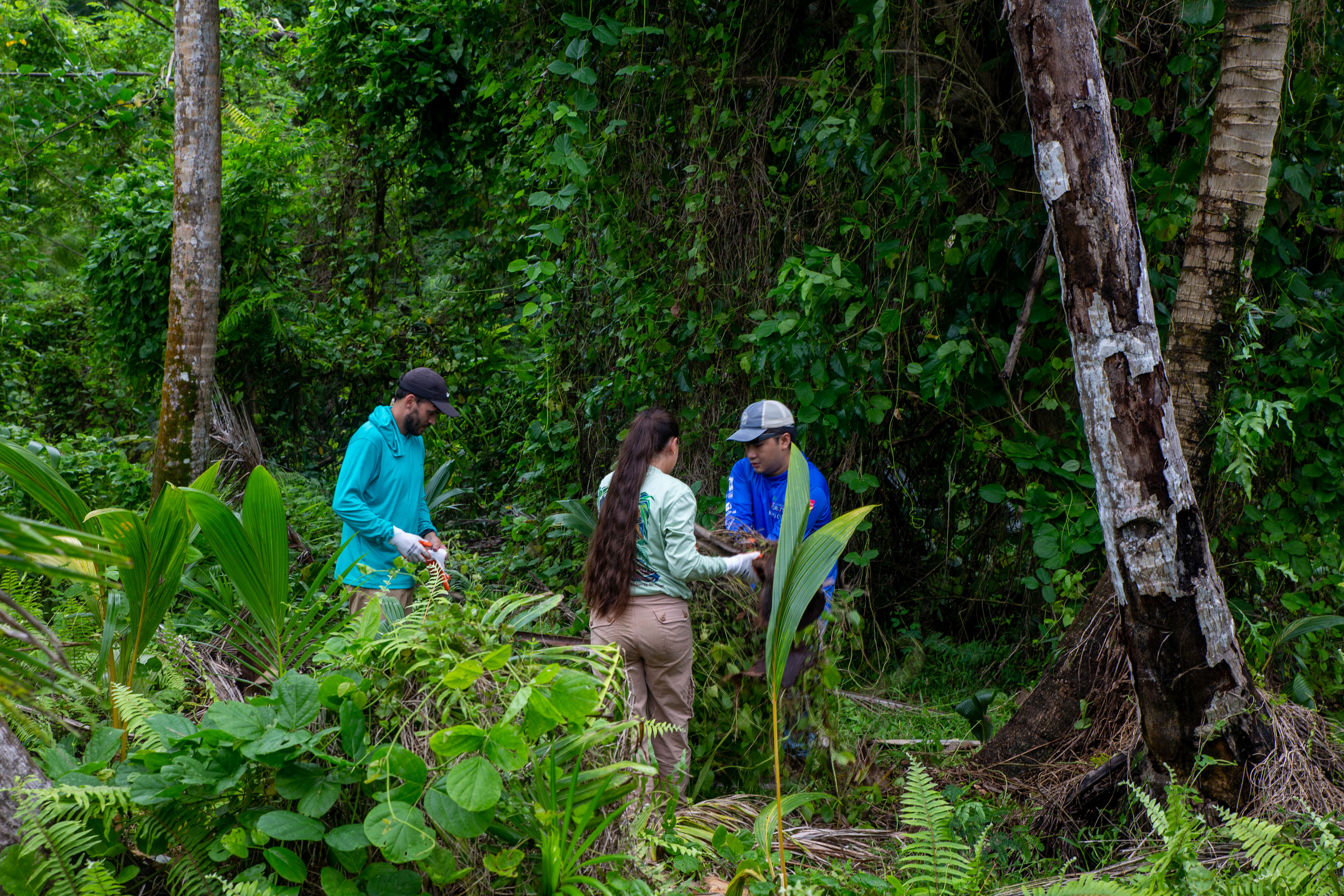 Three Kupu members are hand pulling invasive vines from the limestone forest on Guam National Wildlife Refuge.