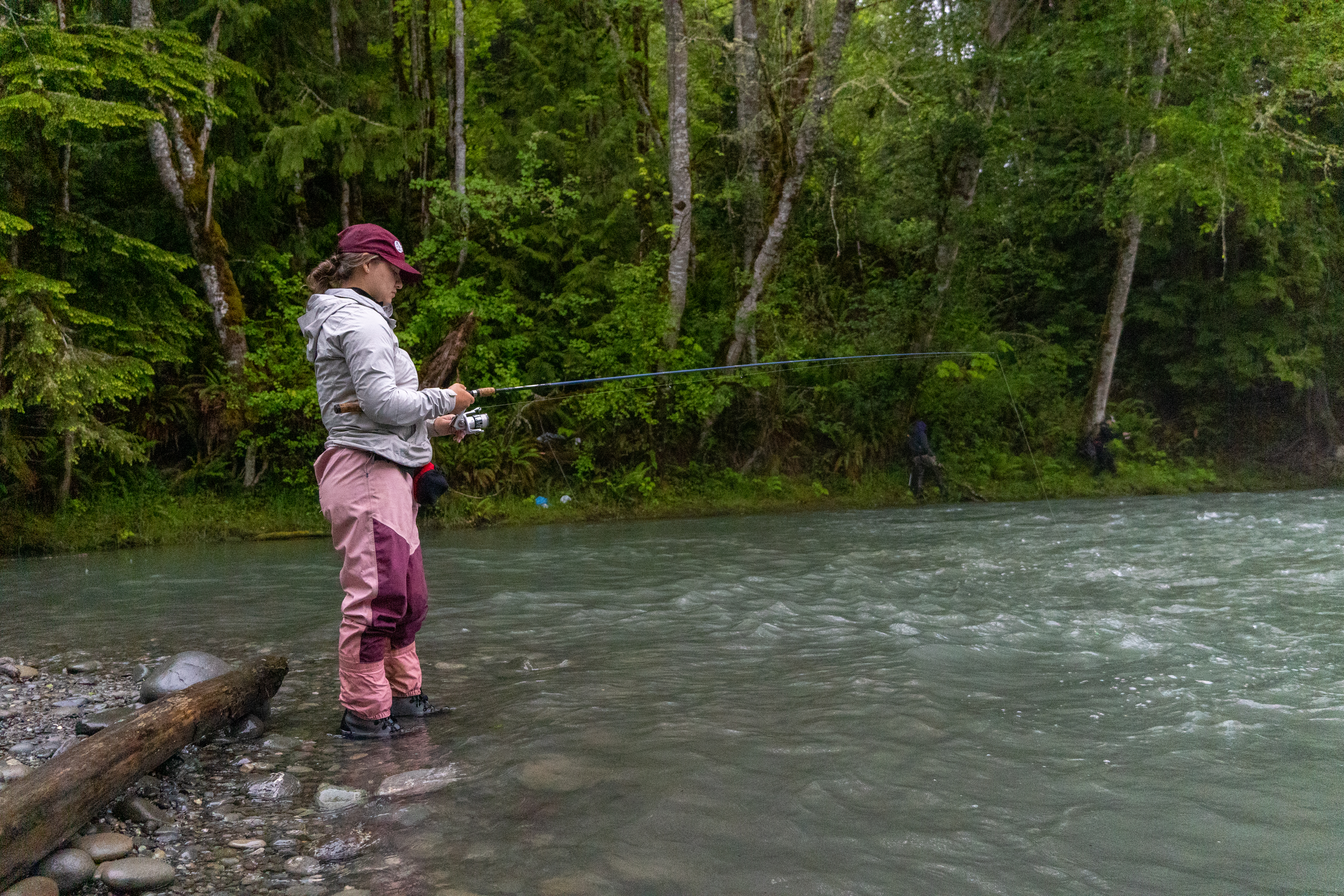 Fisheries intern, Hannah Ferwerda, sampling for fish in the Dungeness River using the hook and line method.